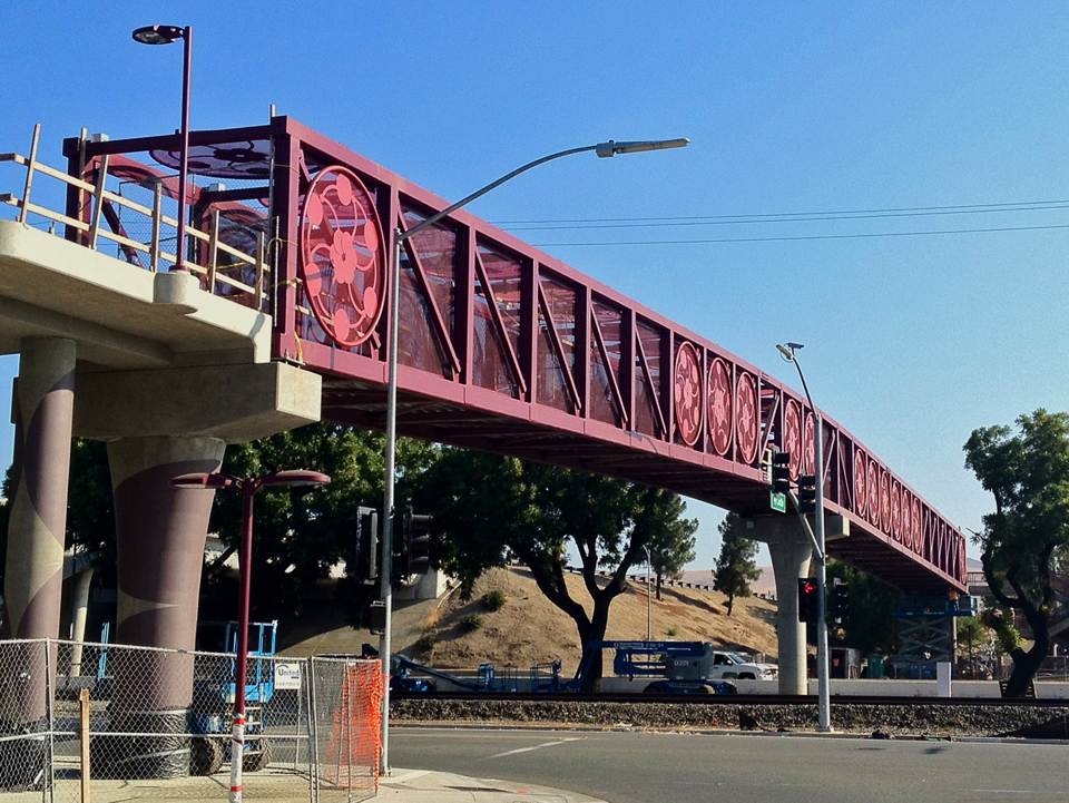 Sponsored by the VTA and San Jose Office of Cultural Affairs, the project includes Public Art, allowing us to create neighborhood identity symbolized by cherry orchards, expressing cycles of life, growth and rebirth. The bridge’s colors reflect the life cycle of the cherry, ranging from deep reds and purples to the blush pink of blossoms.
