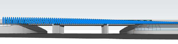 Every decision in this design process is influenced by our personal aesthetic, our intuitive understanding and our knowledge gathered from experience. We start out looser and freer in our initial sketches seeing how far we can stretch our imaginations. Then at each step we refine the scheme to fit the concept and the site with tighter and tighter criteria. This allows us to create, develop and propose imaginative solutions at difficult sites that successfully convey a strong concept. Mirroring the fins in a graceful arch across the bridge created a large gesture that incorporated the entire site, expressing the concept at an appropriate scale.