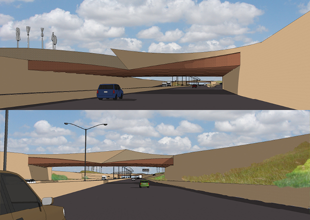 A five-mile highway improvement east of downtown Wichita, the Kellogg project makes a grand gesture through the plains. Using the influences of local geology, industry, history, and the imagery of wind through the prairie, we sought to contextualize this stretch of road. The highway runs through a stepped canyon of wavy walls with wind and grass patterns planted with native landscaping. Crossing this canyon are two bridges. This bridges need to span the site and relate back to it. We created this link by adding form to their sides, transforming basic bridges into sculptural elements.