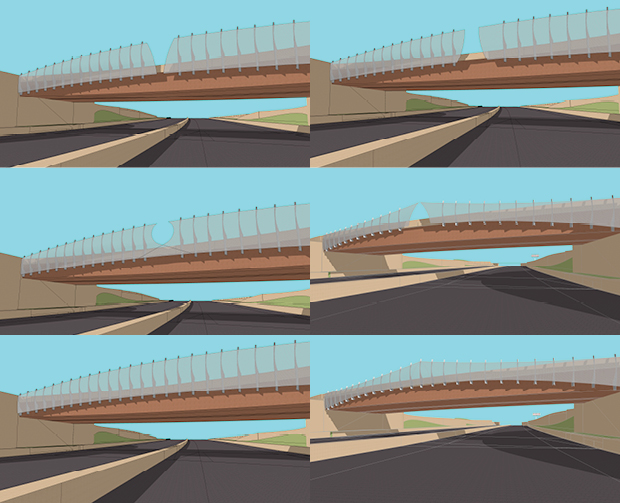 When modifying the concrete barrier became unfeasible, we move to a concept of mesh screens attached to the bridges. The mesh screens would add form and lighten the appearance of the bridge. At night, they would be illuminated to create beacons at each bridge. The mesh related back to air and sky through both its material and its aeronautic shape.