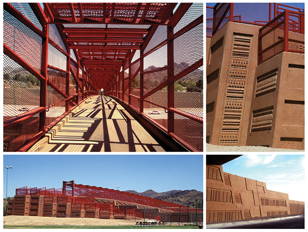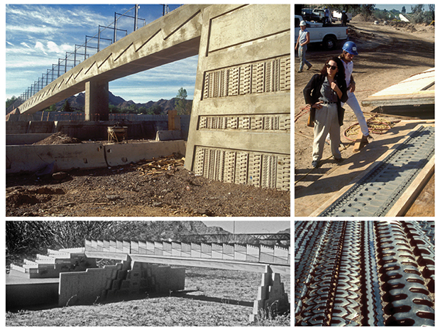 Patterning is a hallmark of our work and we have been revolutionary in creating techniques to add patterning to concrete while working within standard construction processes. Vicki invented a way to use tire treads as ready-mades for creating molds and many of the early projects, such as Dreamy Draw, explore the possibilities of this technique. However tire treads limit patterns to linear expressions and her work moved past this, making stronger connections to site, as seen at La Cholla, above and below. La Cholla was Vicki’s first project using CNC technology to create surface relief.