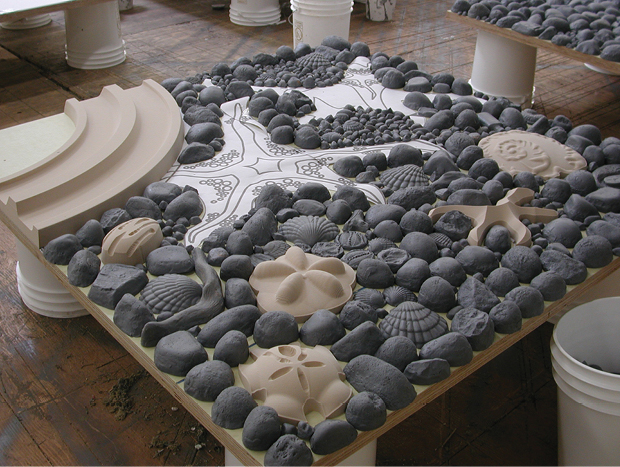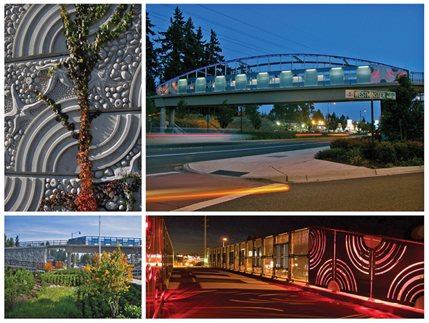 Hand placing stones and other ready-made elements with custom sculpted features allowed Vicki to push the patterning even further. The general movements of the pattern could be worked out and then the specific textures developed digitally. These first attempts at creating a carving to use in a surface relief digitally were experimental but ultimately successful and serve to inspire further exploration of the possibilities of digital modeling. La Cholla and Shoreline Interurban Trail Pedestrian Bridges, above and below, both show how hand placed elements can fit into digitally modeled and carved elements.