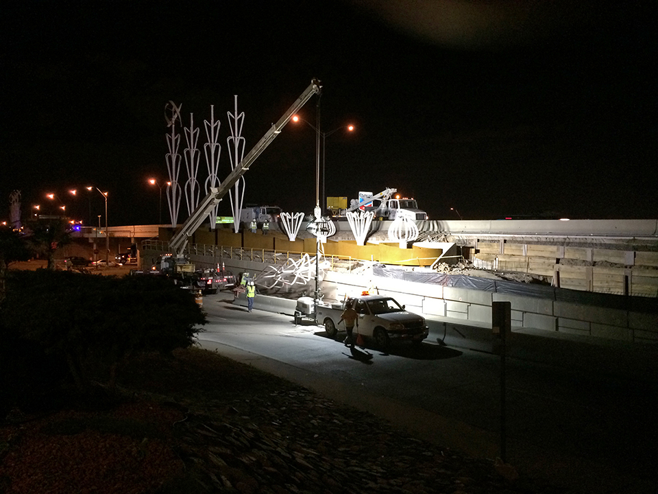 By mid-September, the turbine armatures and light sculptures were being installed at Airway. Installation took place at night, in order to minimize interruptions to traffic flow.