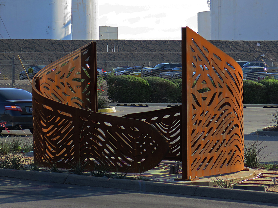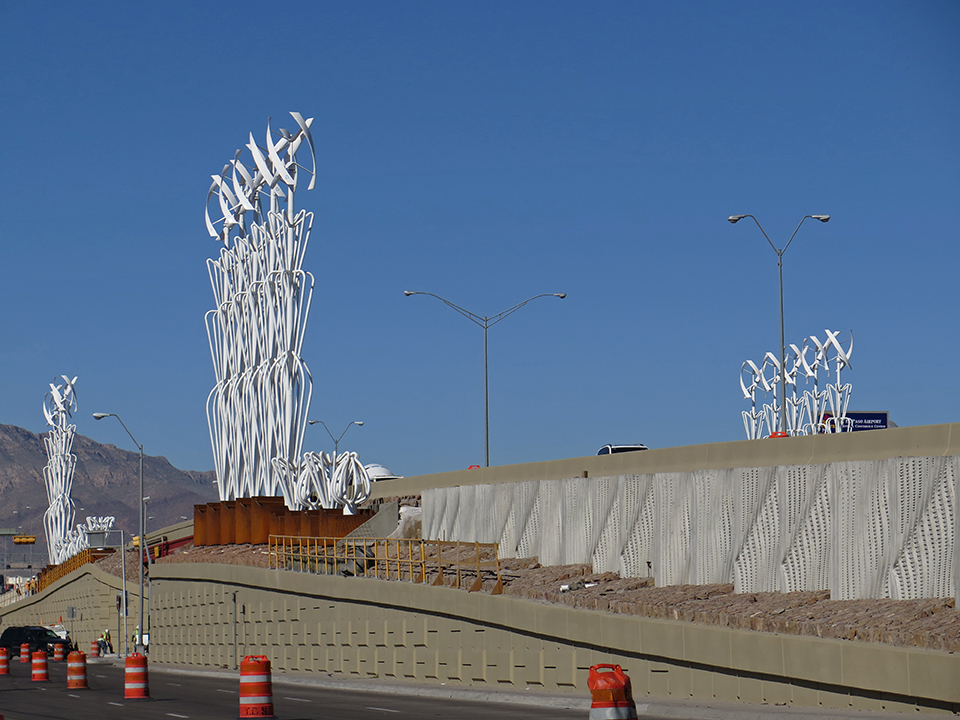 The El Paso Public Art Program hosts a mentoring program for their arts community. Local artists compete to join a roster for upcoming public projects, working with established artists with track records in Public Art. This program helps El Paso artists to bridge their studio art skills with the parameters of Public Art and public process. During my five years of working in El Paso, I have mentored three local artists. All have benefited from their experiences and they have advanced their careers. Anastacio Rivera is my intern for Airway. He created the pattern work for the median sculpture. To create the artwork, we required Anastacio to learn several computer programs, SketchUp and Illustrator, encouraging him to work more efficiently, electronically, helping him and our team to implement his work into the contract documents for construction. His work has turned out extremely well.