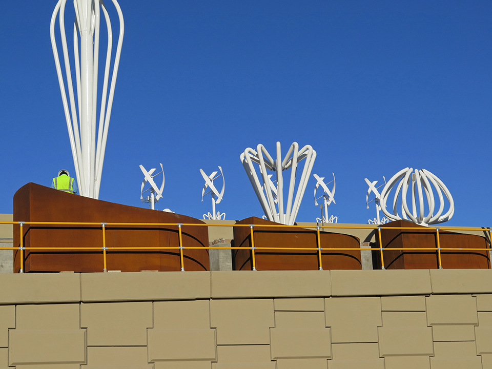 The turbines stand tall against the backdrop of the Staybridge Suites, one of the new hotels on Gateway Boulevard East.
