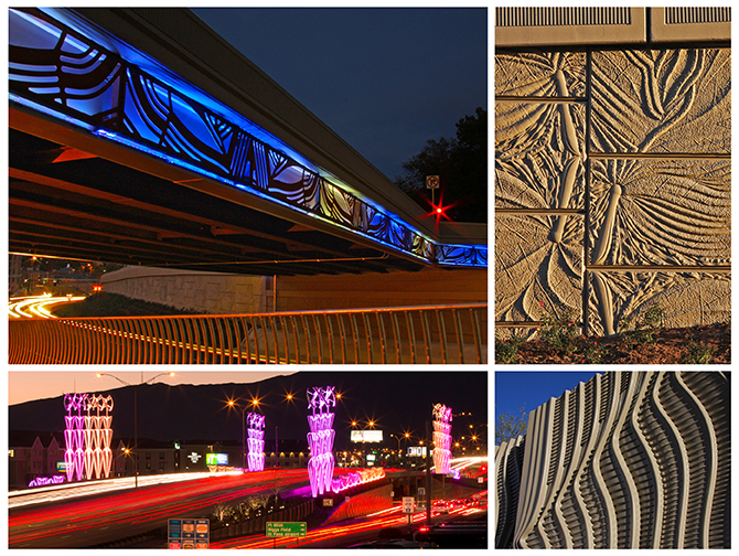 Both Arlington (Arlington, VA, above) and Airway (El Paso, TX, below) are inspired by their native landscapes, and they include rain harvesting, native plants and LED lighting to promote an experience of place. Airway includes 16 functional wind turbines that create a dramatic effect while producing energy. These turbines are tied into the City grid. The LED lighting is programmed to reflect El Paso’s seasons and holidays. At Arlington, the lighting suggests sky tones, transitioning through hues that are patterned to the length of a grill unit. Both projects create landmark gateways for their communities.