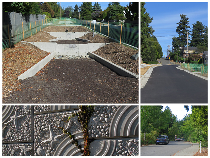 Similarly, the Broadvew drainage project presents a great opportunity for neighbors to talk with each other, set common community goals, and to work together to make Broadview a more livable, sustainable and attractive neighborhood for everyone involved. This project presents both public and private opportunities for correcting drainage issues and promoting sustainability. As a neighborhood, Broadview has many positive attributes. It boasts views of the Puget Sound and a strong connection to Carkeek Park, that could become even more prominent if 12th Avenue were to become a neighborhood green street. As a neighborhood, Broadview has wide streets that afford the transformation to green streets. This could become a “green” neighborhood with residential green streets, residential rain gardens and communal pocket parks and play areas, enlivened with public art to promote place and wayfinding. Through the process of renovating Broadview’s drainage and sewer systems, Broadview can be transformed to become much more than it is today. It can set precedents for future residential developments and renovations by following the guidelines of the Broadview – Bitter Lake – Haller Lake Neighborhood Plan Update. It can become a model of suburban sustainable development.