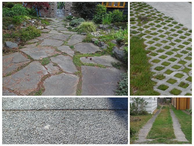 Stepping-stones, grasscrete, gravel, and pervious concrete promote the absorption of runoff on site. Pervious surface treatments should be considered for sidewalks, driveways, and parking strips. Currently, many of the parking strips and driveways are concrete or paved, contributing to the drainage problems in the neighborhood. Many existing site conditions combine excessive hardscape with steeply sloped road surfaces. The combination of ground conditions and hardscape surfacing is contributing to the drainage problems in this neighborhood.