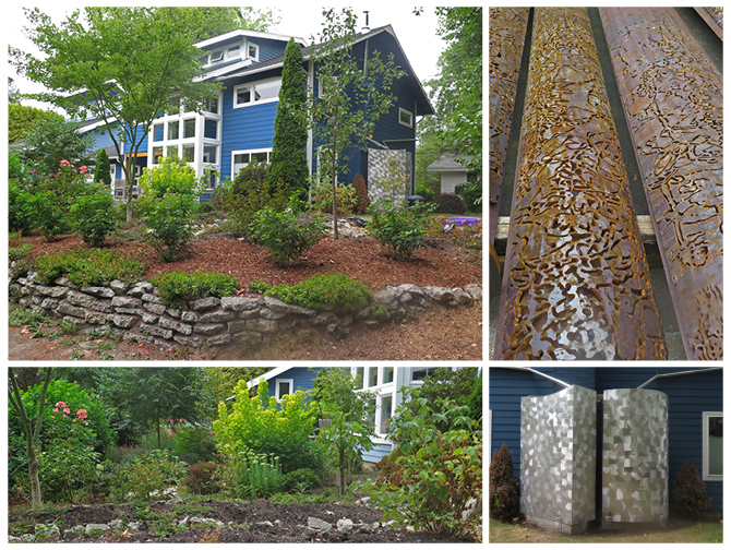 Drought resistant hardy and native plantings combined with principals of rain harvesting promote the absorption of water on site, creating sustainable healthy gardens that contribute to making the neighborhood more attractive. A handful of homes in the Broadview study area have transitioned their yards from thirsty lawns and shrubs to native plant gardens. Some feature passive rain harvesting, like the above gardens. They are attractive and they attract wildlife, birds and bees.