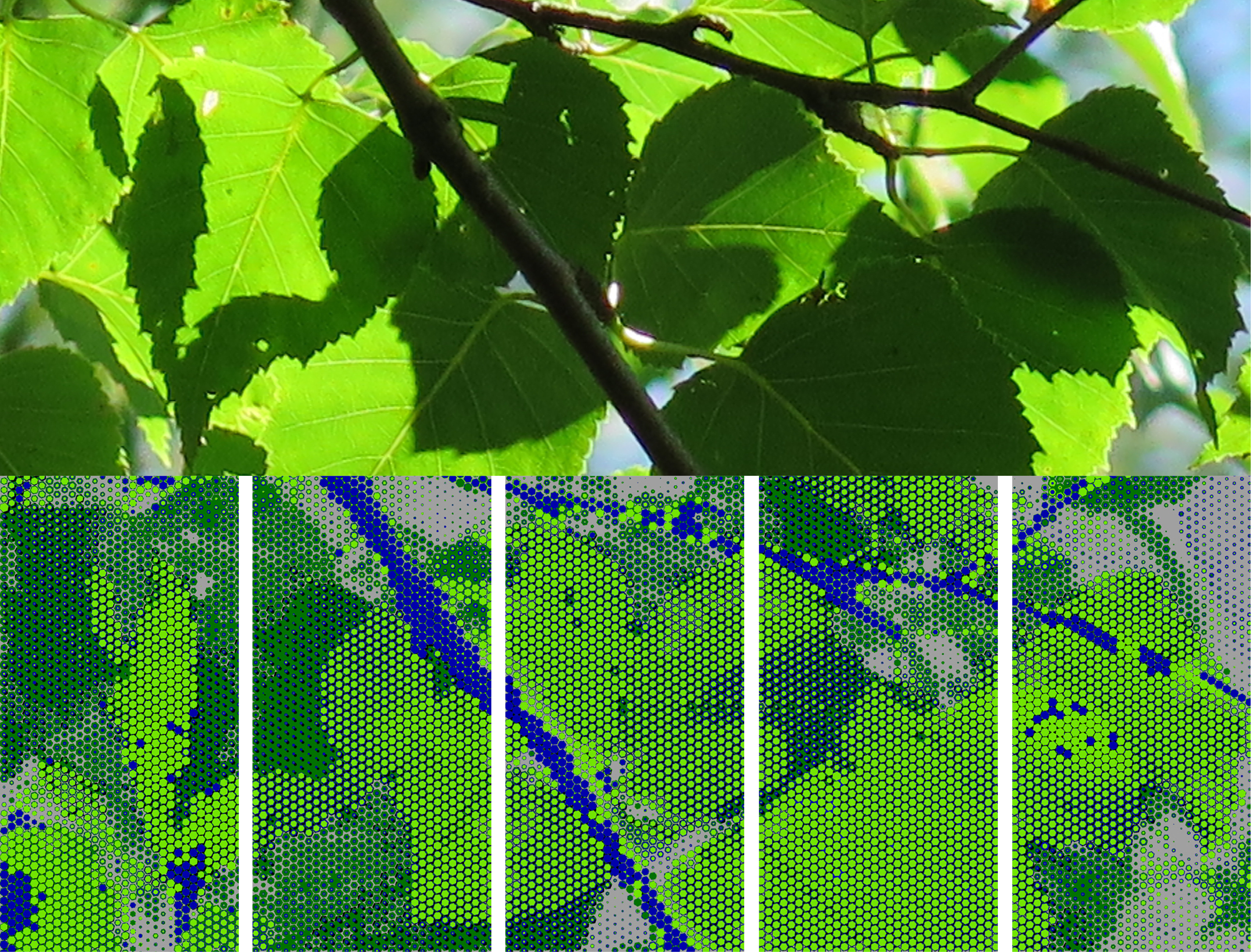We used Grasshopper, a plugin for the 3D modeling and CAD program Rhino that we use in the office for modeling and drafting, to build a tool to transform images from the site into abstract patterns based on hexagons. This meeting of nature and technology was inspired directly by the circumstances of the site.