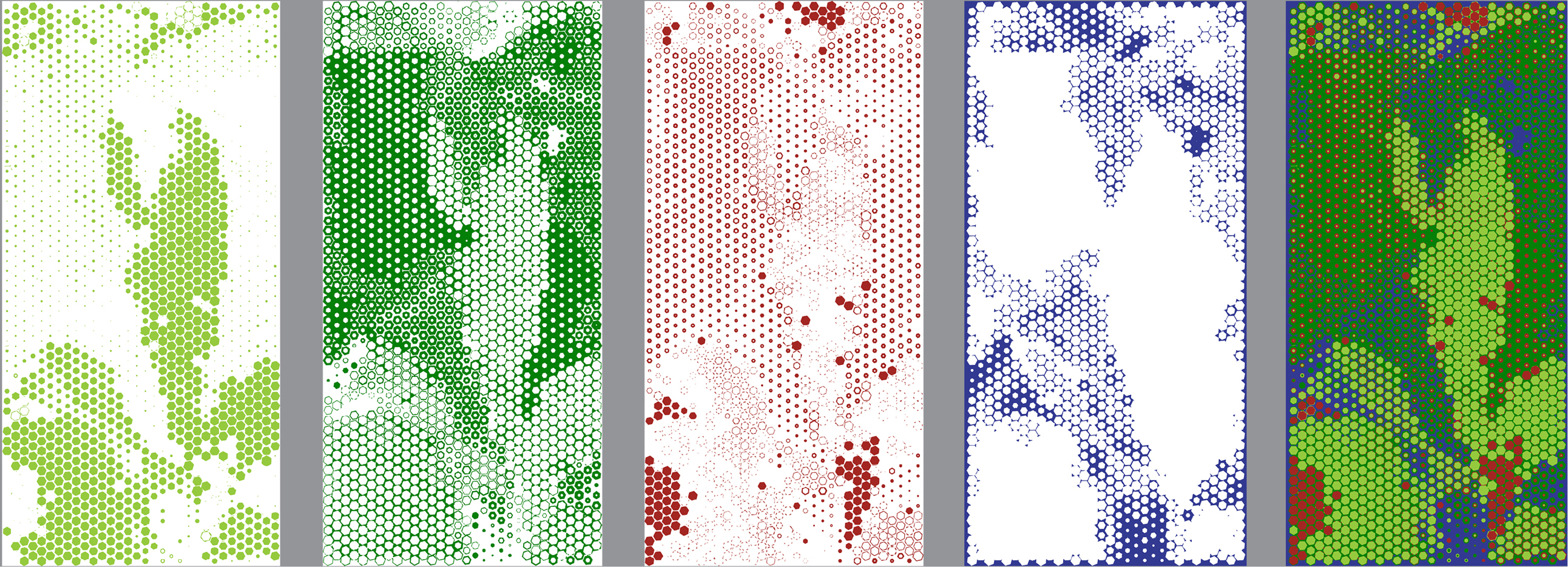 This changing of colors creates a dynamic visual statement from a rather simple pattern system. The pattern uses a small number of unique units that repeat and rotate to create a larger, longer pattern band. Each of these units is made of four layers that combine to make a full image. By selectively changing the colors on these layers we can build a complex pattern from a small kit of parts.