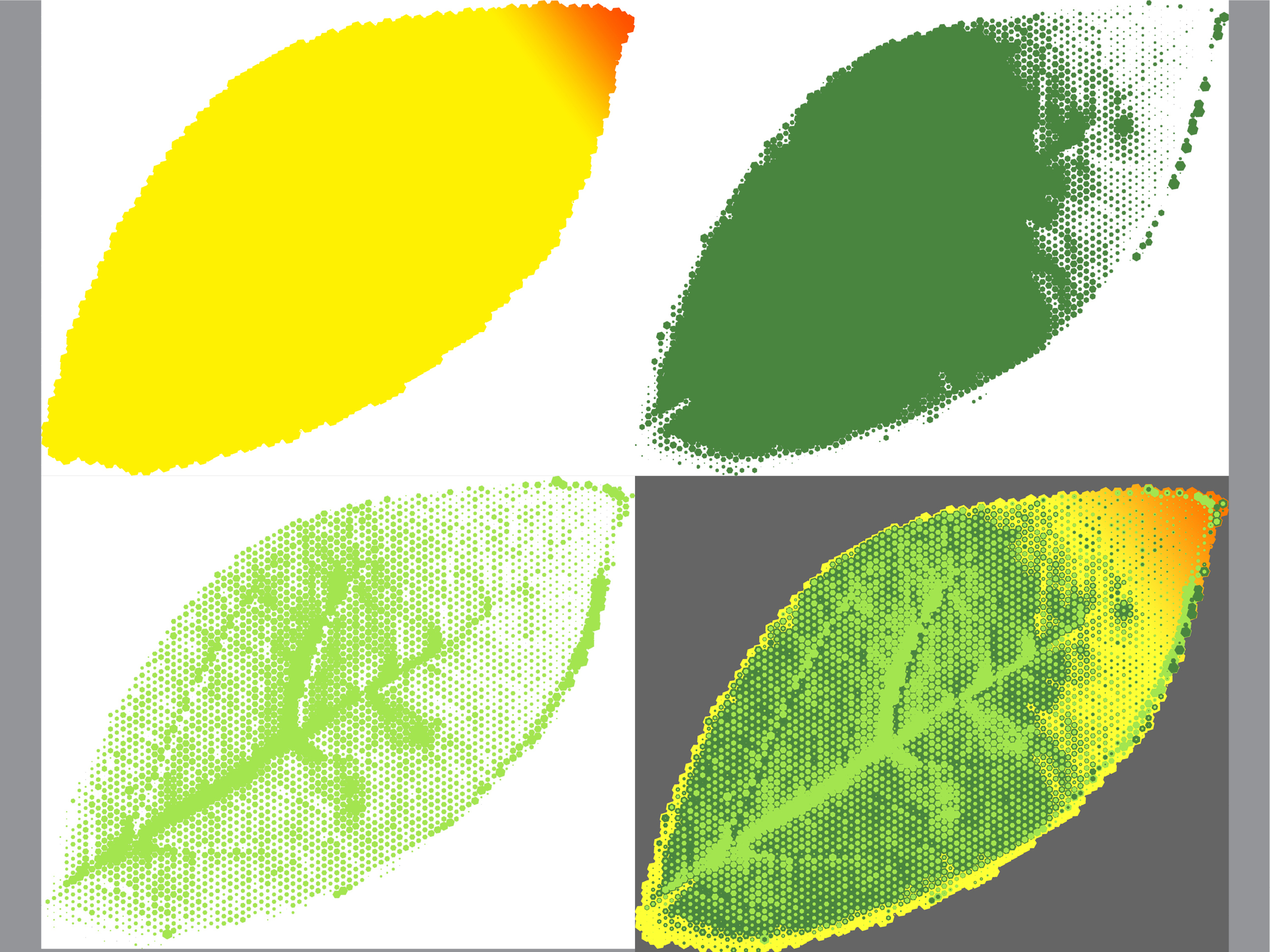 The same system is used the create the large scale graphics on the columns. Because they are painted, the colors on the layers can overlap, making the templates simpler. The three stenciled layers stack up to make the whole image: an abstracted leaf.