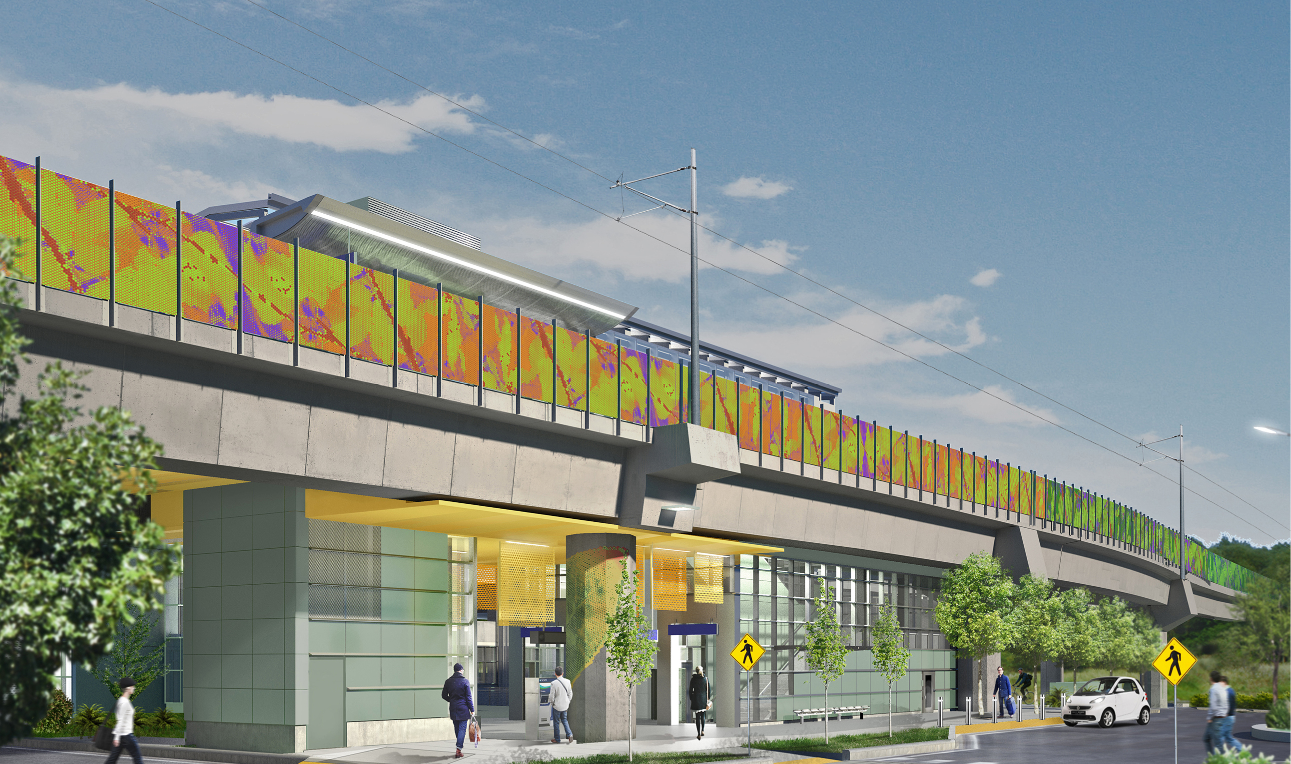 The South Bellevue Station’s Public Art Enhancements include a pattern strip on the facade of the guideway acoustic panels and large graphic images wrapping the columns below the platform. The imagery for these elements comes from the Mercer Slough, a wetland area which surrounds the site.