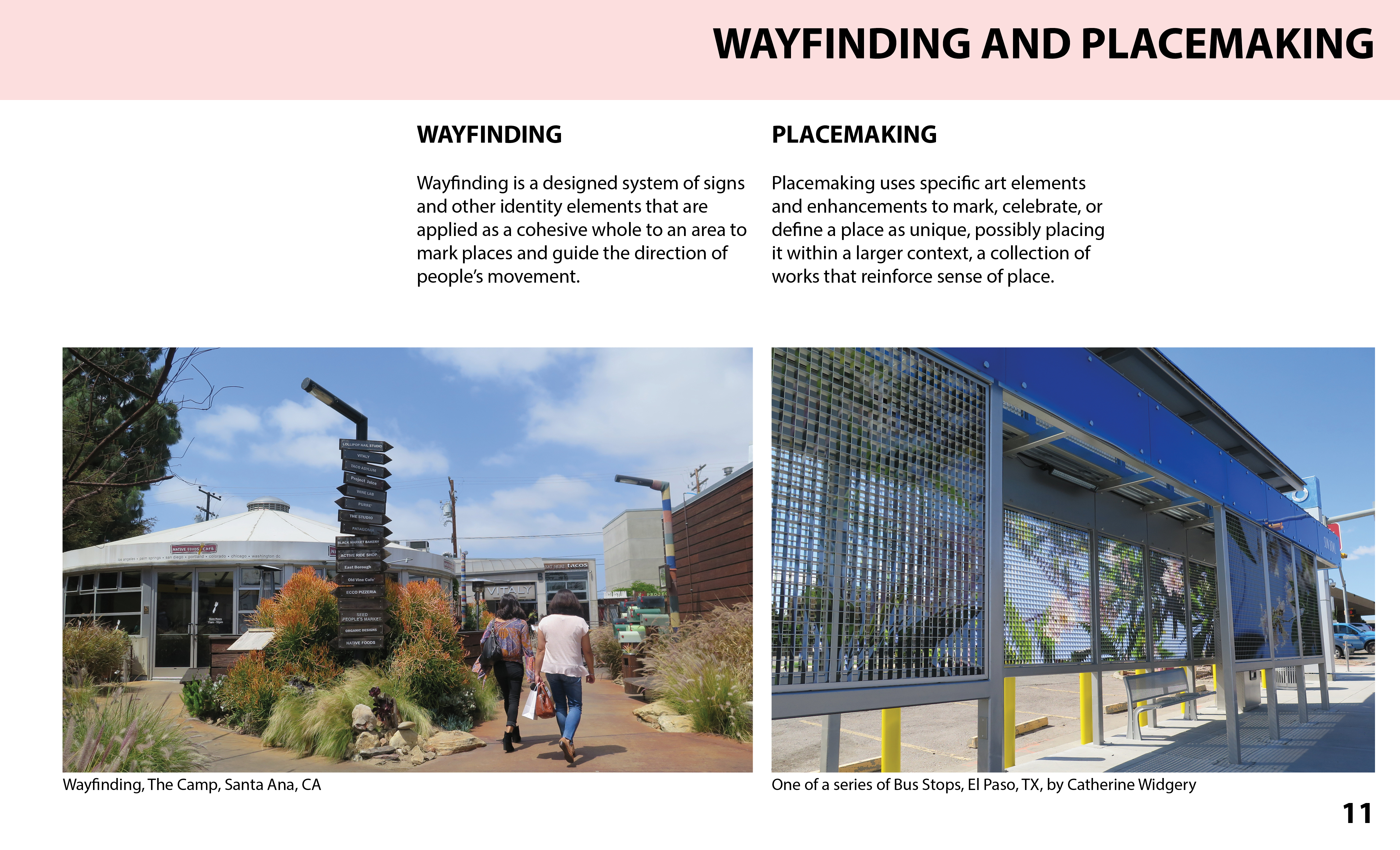 Next is the detailed documentation and analysis of the twelve areas of interest in the SmART Corridor. Each neighborhood has good precedents to be brought forward into future work and places that Public Art and Placemaking opportunities could enhance. Each neighborhood gets a page showing a map of the area and images showing its current condition. These images serve to familiarize those working with the plan to the city by illustrating the sense of place at each neighborhood.