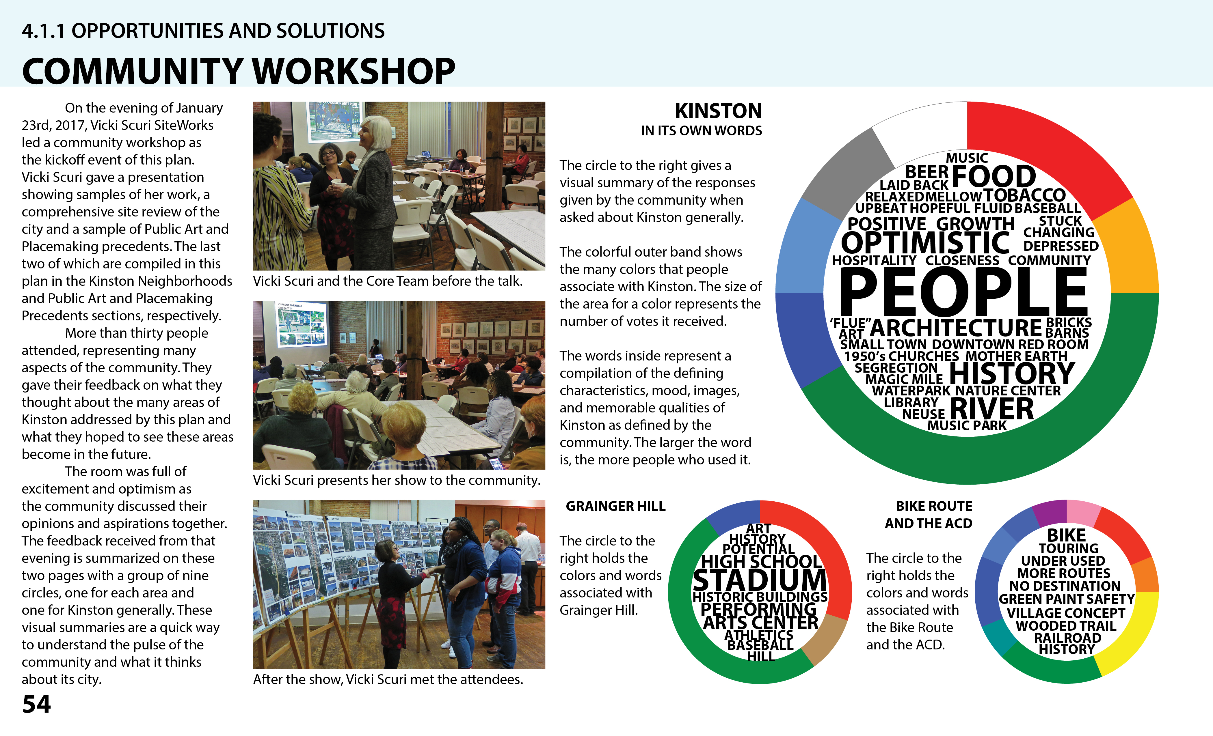 The plan starts with a brief history of Kinston, an introduction to SmART Kinston and Vicki Scuri SiteWorks, SmaRT Kinston’s mission and goals, and Public Art goals, background and definitions. Then are several pages documenting the City, its character, architecture, nightlife, cultural events, local art, music, parks, and farmer’s market. These pages feature several representative images and a column of descriptive text.