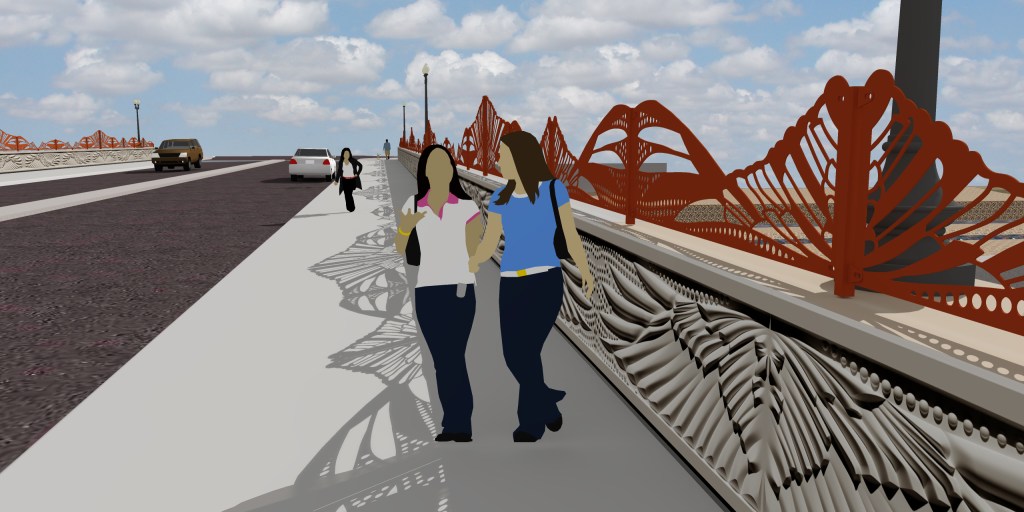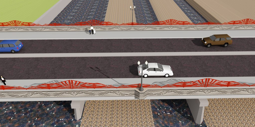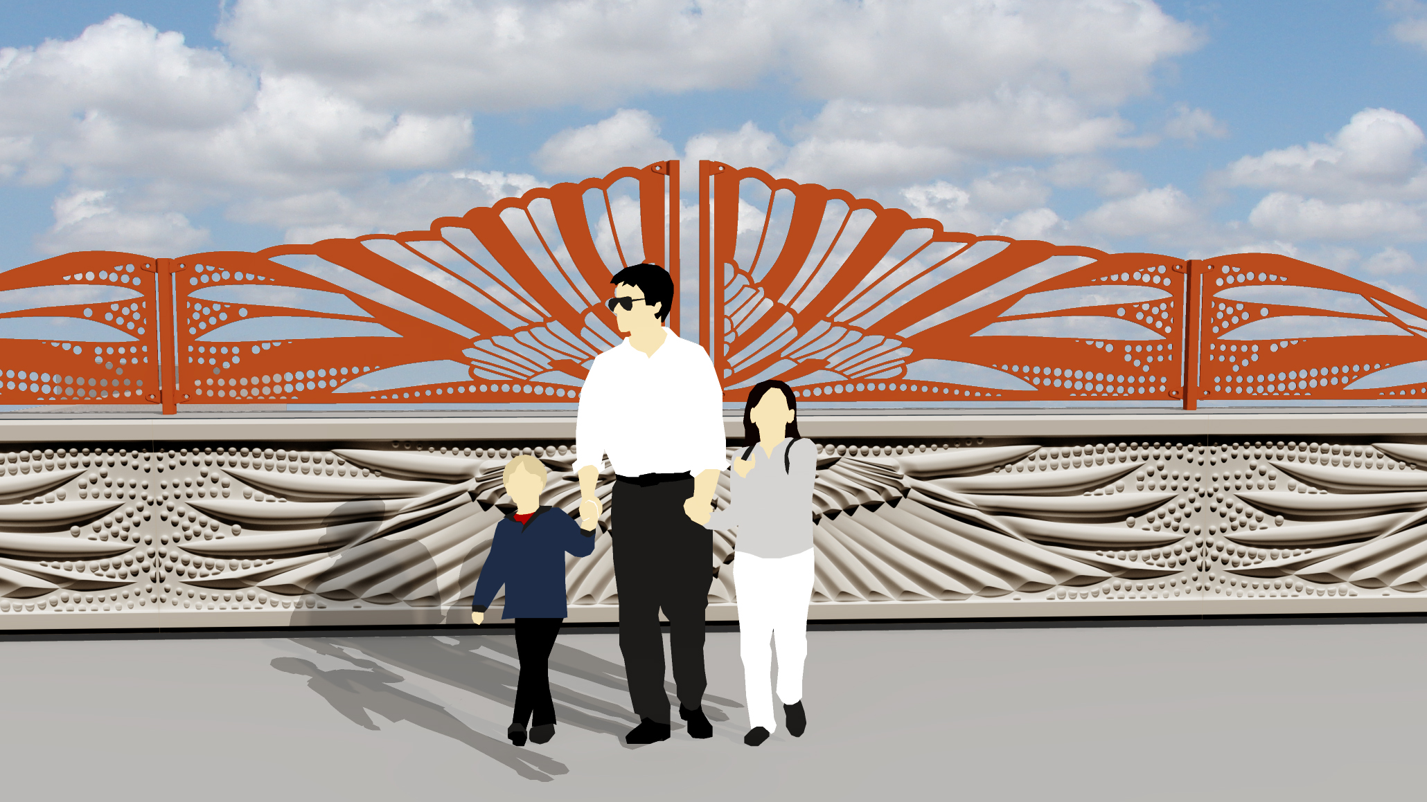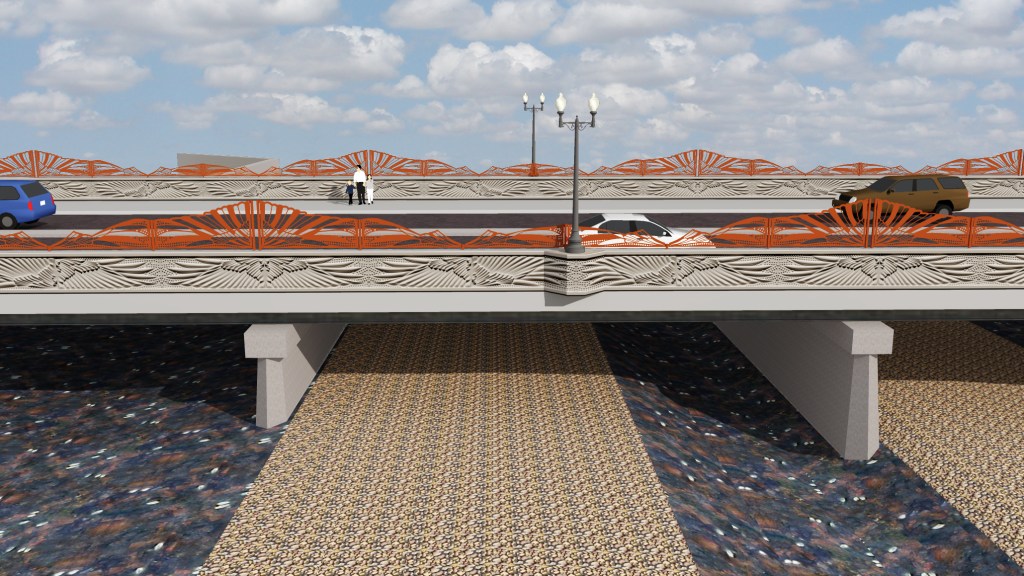 The renovation of the old bridge includes a new bridge deck and concrete parapet barriers with cut-metal grill railings. The new concrete barriers and metal railings became the canvas for our artistic enhancements.