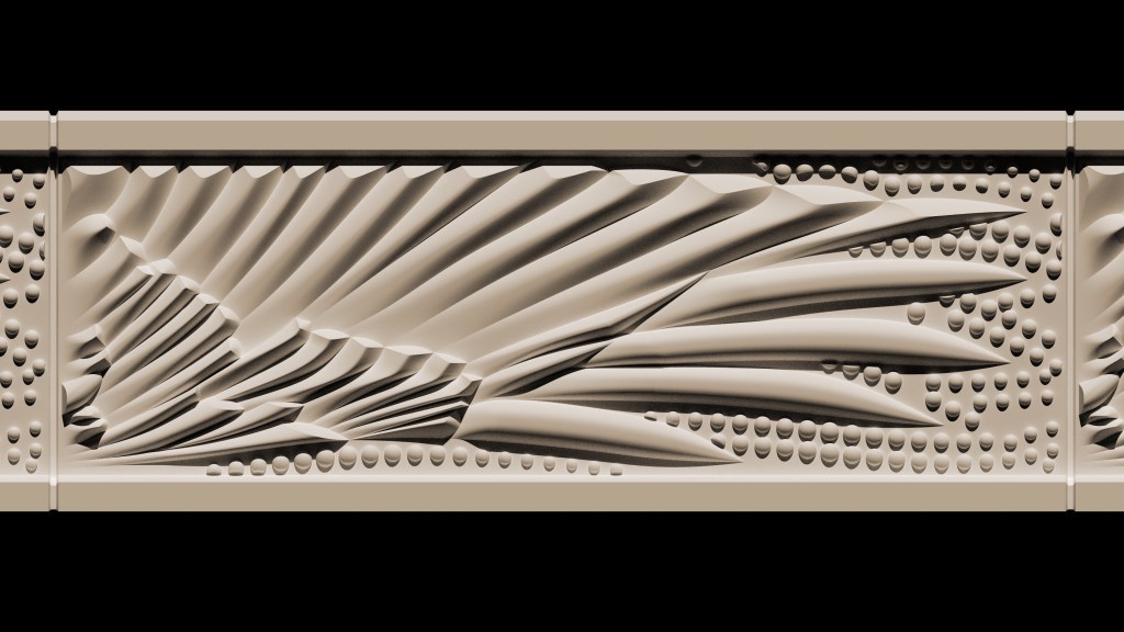 We have interpreted the red-tailed hawk wing in 2″ deep relief, with panels spanning to nearly 9′ in length and 3′-6″ in height. The dimensional form will be created by using a CNC router, which allows for sculpting three-dimensional surfaces with accuracy and precision, while adding a creative touch during the milling process for adding surface textures and directionality. Abstracting and refining these pattern forms allowed us to reference local wildlife and create a design that relates to its context.
