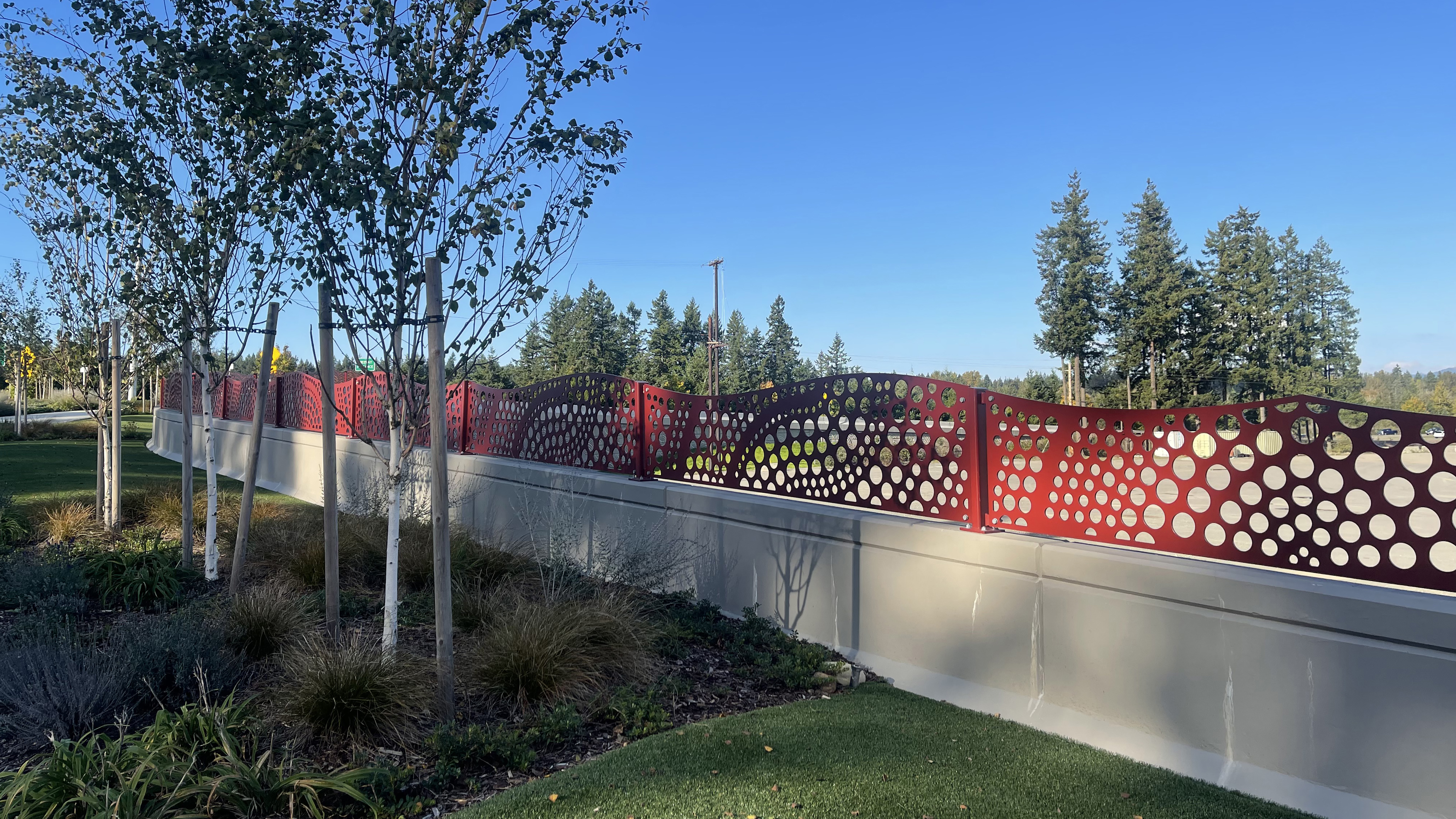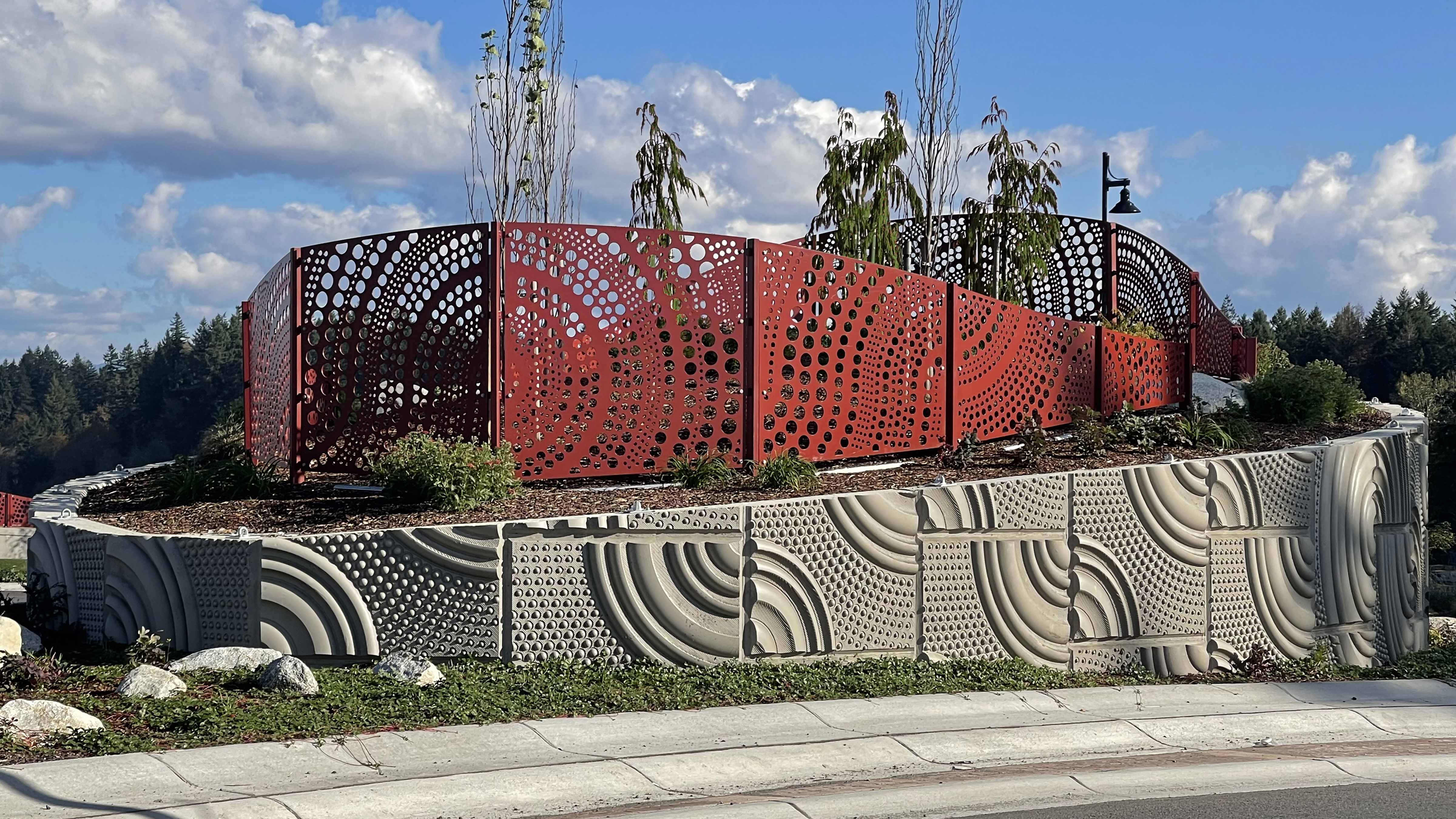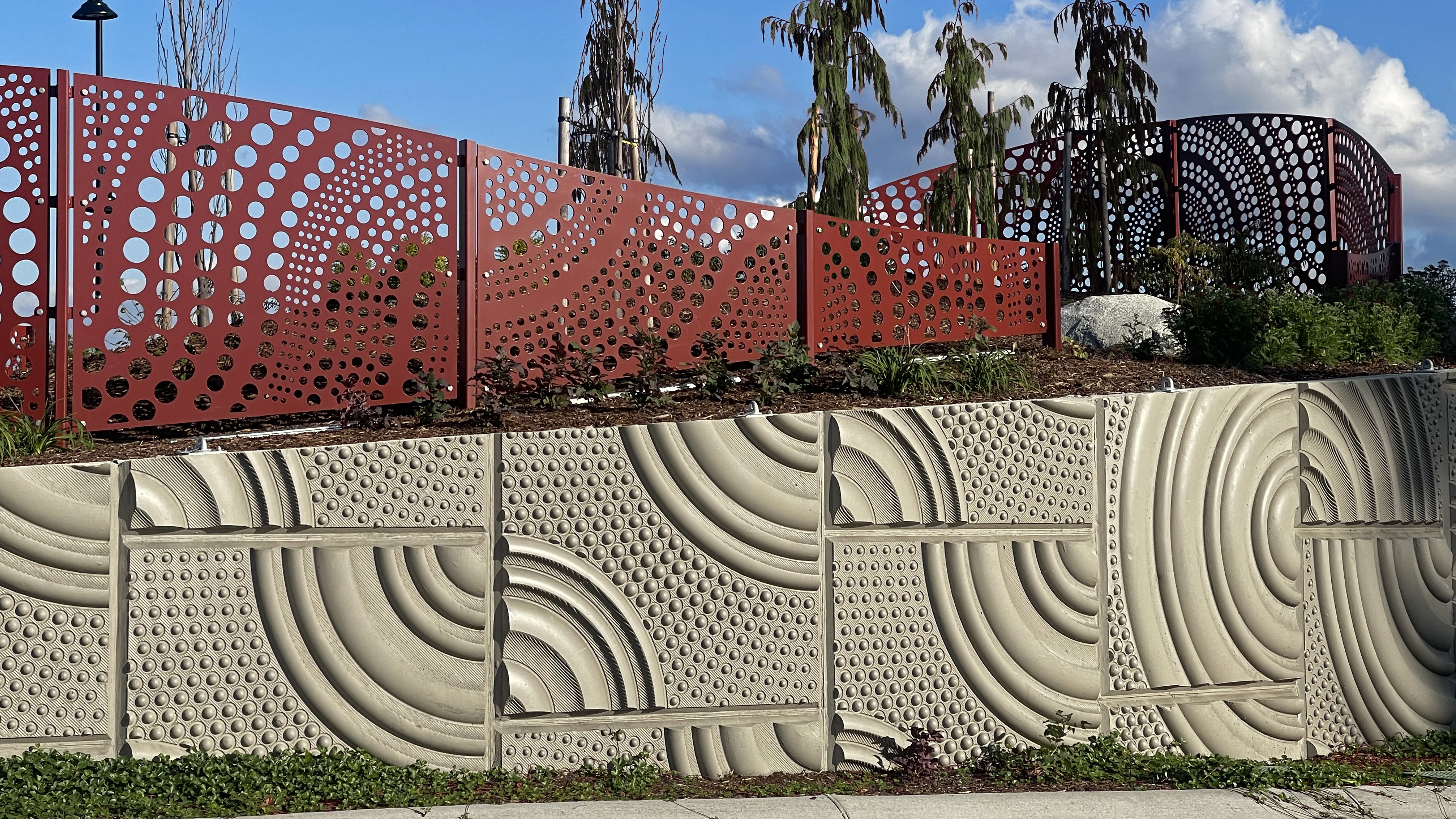 We designed the screens, working closely with the Landscape Architect and the team, to fit into the landscaping of the medians, wrapping through the space to create a volume of form and pattern.