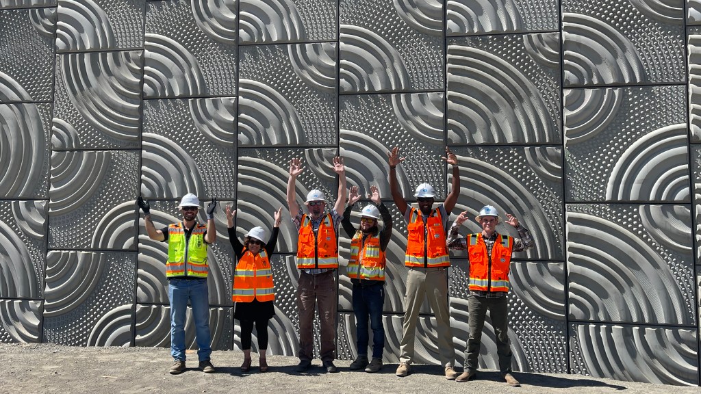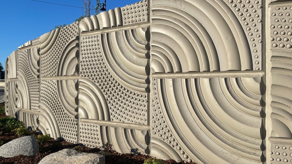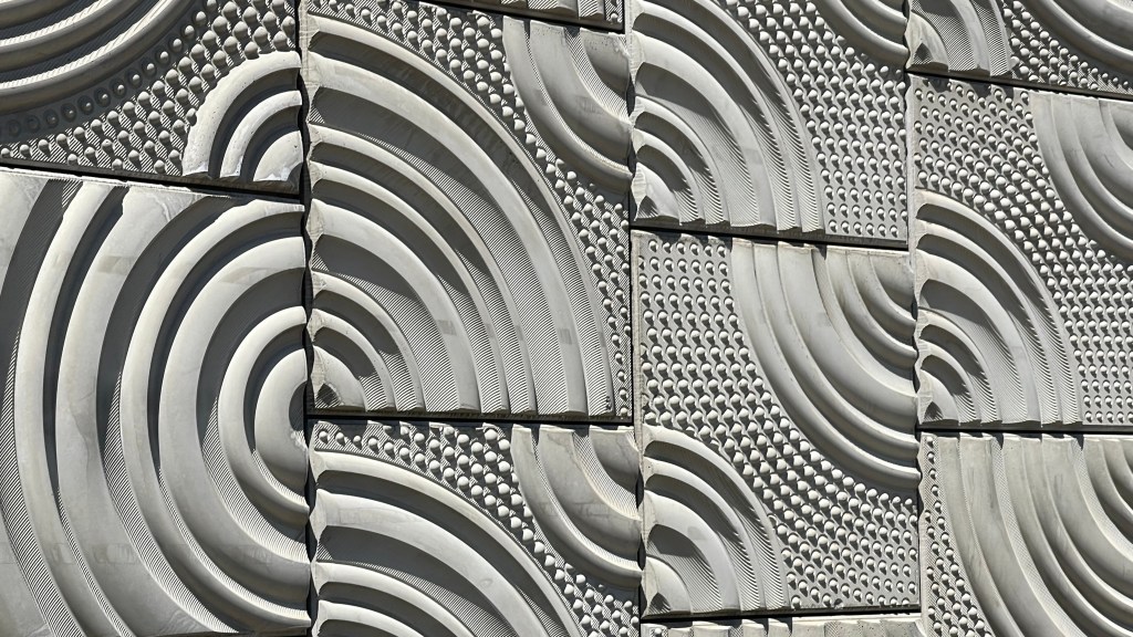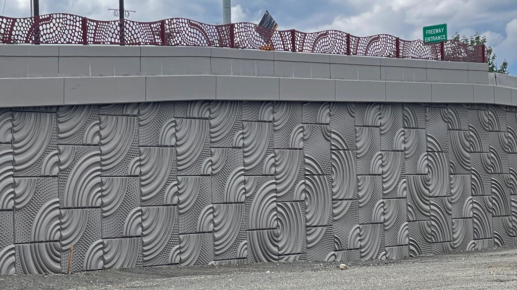 The landscape screens in the project’s two roundabouts, and the railings atop its walls, continue this water pattern, translated to cut metal. These metal screens trade the subtleties of the concrete relief for a strong graphic statement, fitting the landmark status of these entryway pieces.