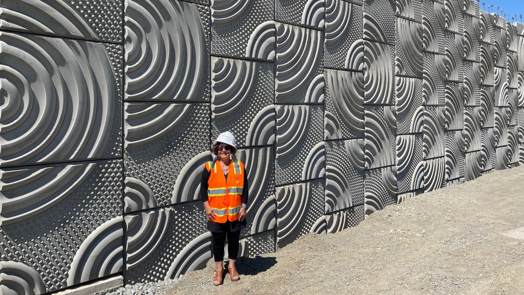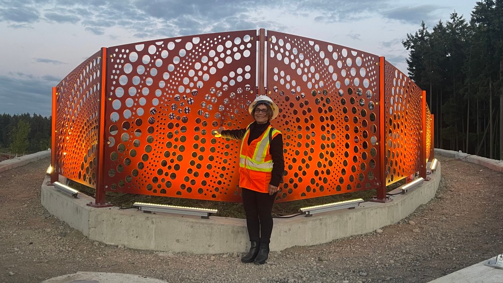 The pattern screens are illuminated at night and serve as entry beacons to the development. With their lighting, the screens have a commanding presence at the site. The image above, shows Vicki inspecting the work during construction and gives a sense of the contextual scale of the screens.